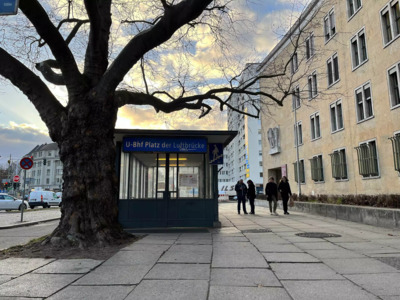 This tour begins at the entrance to the Underground Station, or "U-bahnof", "Platz der Luftbrücke". We'll begin outside Exit Mehringdamm/Fidicinstraße, on the corner of Mehringdamm and Platz der Luftbrücke. In front you, just across the street, is a 1970s concrete building with yellow-framed windows.