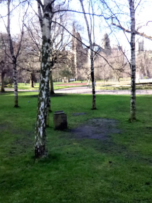 Enter West Princes Street gardens and towards of the West of them, and west of the bandstand, you will readily see the prominent fountain. The start of the trail is just to its south east. Note: At the end of the tour a short bus journey up to the top of the Mound takes you very close to the start of the University Years tour