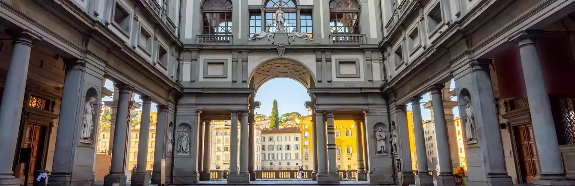 The tour begins on Piazza degli Uffizzi. The correct starting point is in the middle of the square, next to the statue of Leonardo da Vinci.