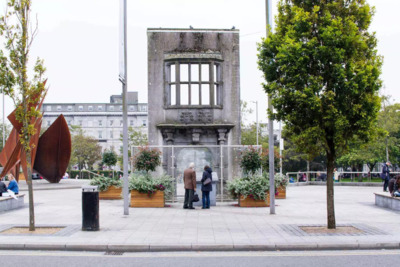 The tour begins at the Browne Doorway in Eyre Square. If you're in the middle of Eyre Square you'll see some steps in the north of the square. Walk up the steps and you'll see a free standing stone doorway with perspex glass surrounding it for protection. During the summer you'll see flagpoles near the doorway with flags flying overhead with the names of the 14 Tribes on them. This is the Browne Doorway.