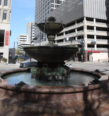 From the Street Car’s Library Stop near 9th & Main, walk south to, and cross, 10th Street. If you were on the northbound street car, you’ll need to cross Main Street. You’ll need to be standing next to a large circle fountain at the southwest corner of 10th & Main.