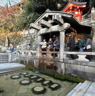 You are now standing in front of another important attraction of the temple, a waterfall of holy water called ''Otowa-no-Taki Falls''.