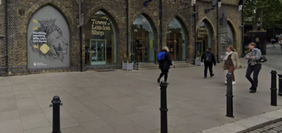 The tour begins near the Tower of London, outside the Tower of London gift shop.