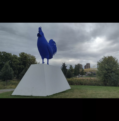 As you can see, this rooster, which is titled Hahn/Cock, is very, very blue. It's electric blue. It might be the bluest thing you will ever see. It's also, arguably, the second most famous piece in the sculpture garden.