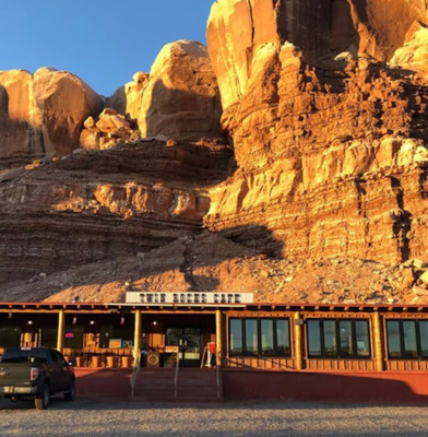 The tour starts in front of the Twin Rocks Cafe, just off highway 191 at the northeast end of the town of Bluff, Utah.