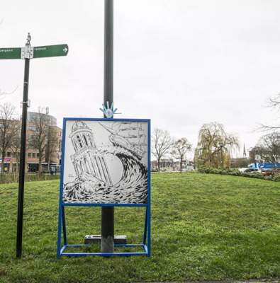 Aan de zijkant van theater De Spiegel staat tegen een boom op het grasveldje de eerste illustratie van deze audioroute. Dat is het beginpunt.